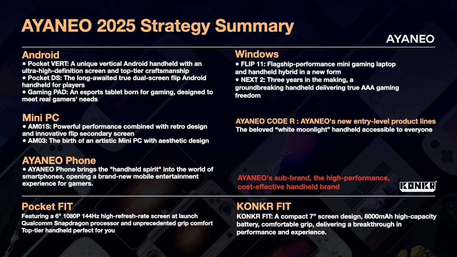 Кроме того, разработчики готовят для игроков две новые и бюджетные серии Code R и KONKR. Суббренд KONKR представит две портативки: Pocket Fit – Android, чип от Qualcomm, экран со 144 Гц и диагональю шесть дюймов, и Fit – Windows, экран с диагональю семь дюймов, аккумулятор на 8000 мАч.