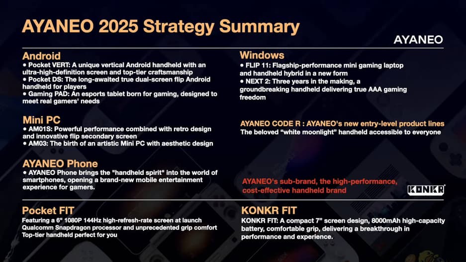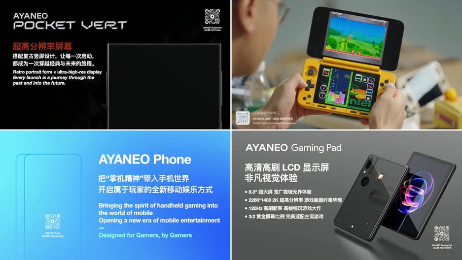 Станет доступна портативная и складная консоль с двумя экранами Pocket DS, использующая в качестве операционной системы Android. Появится смартфон под названием Ayaneo Phone, предназначенный для геймеров.