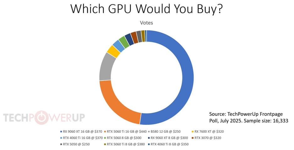 Согласно результатам опроса, проведённого порталом TechPowerUp, в котором приняли участие более 16 тысяч человек, видеокарта Radeon RX 9060 XT с 16 ГБ памяти набрала 52,4 % голосов. Её выбрали более 8500 участников как наиболее предпочтительное решение при цене $370.
