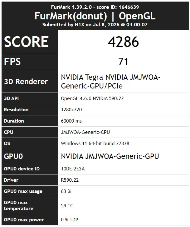 Платформа Nvidia N1X продолжает демонстрировать прогресс: в базе данных бенчмарка FurMark зафиксированы результаты тестирования инженерного образца, обозначенного как JMJWOA. Устройство набрало 4286 баллов при средней частоте 71 кадр в секунду в стресс-тесте с разрешением 720p. Наиболее значимым выглядит сам факт стабильной работы под управлением Windows 11, что свидетельствует о проверке совместимости системы на кристалле с операционной системой и драйверами.