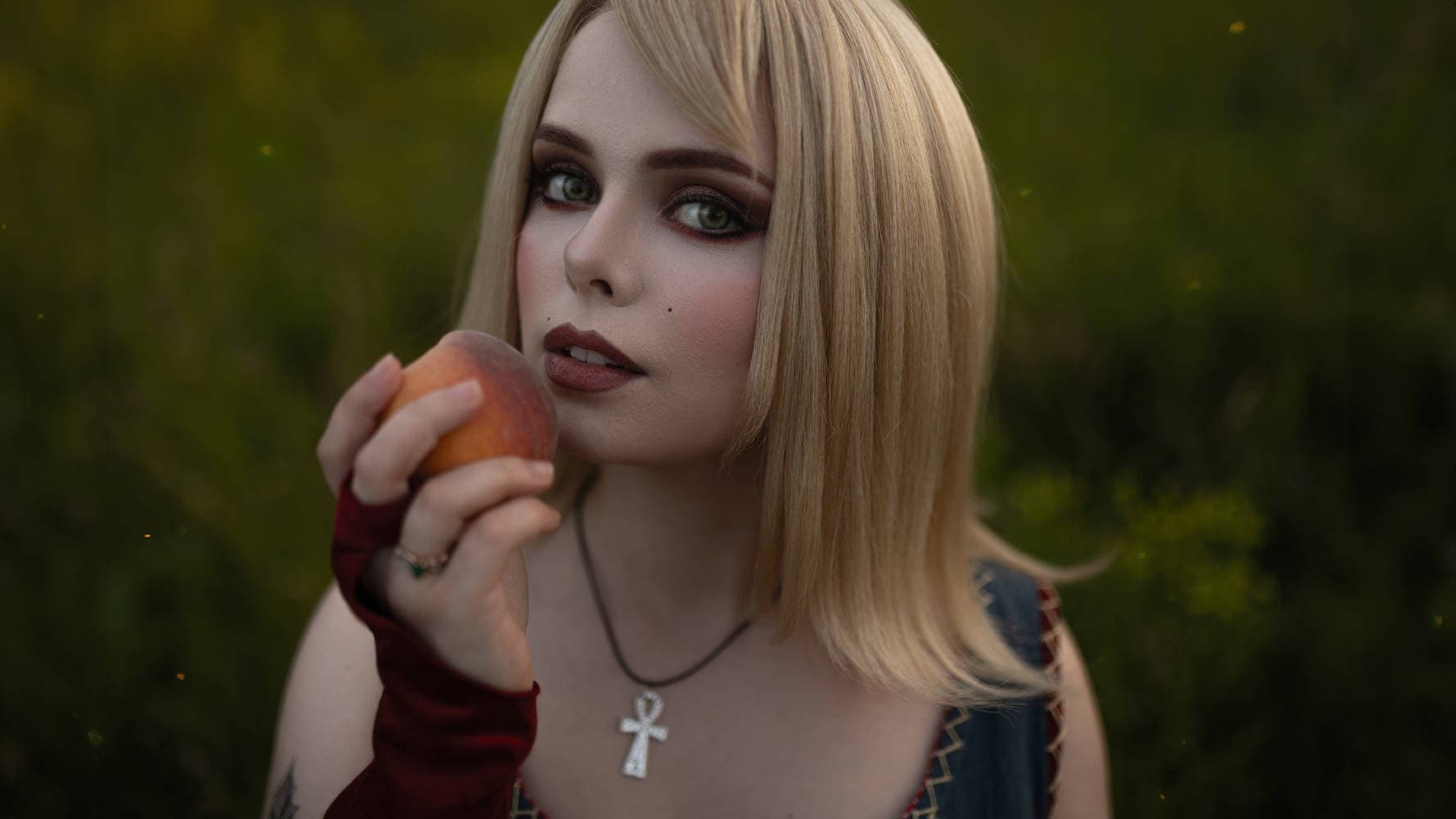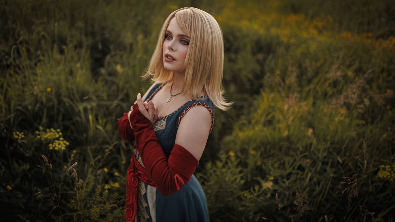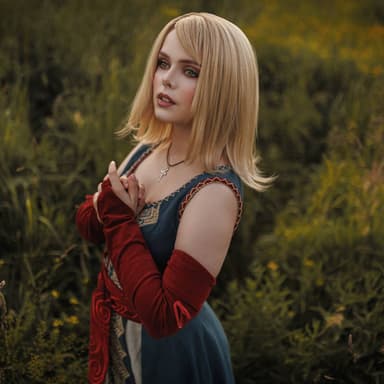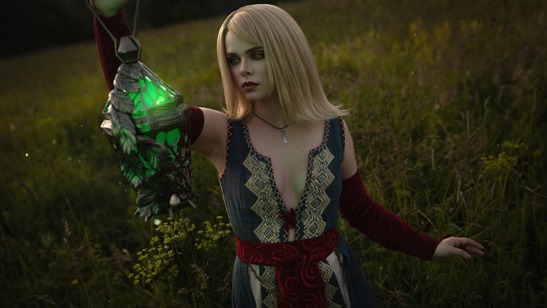 На фотографиях девушка предстала в длинном голубом декольтированном платье с отдельными красными рукавами и красным поясом из квеста «Дружеская услуга» (плюс на шее красуется медальон в форме креста анха).
