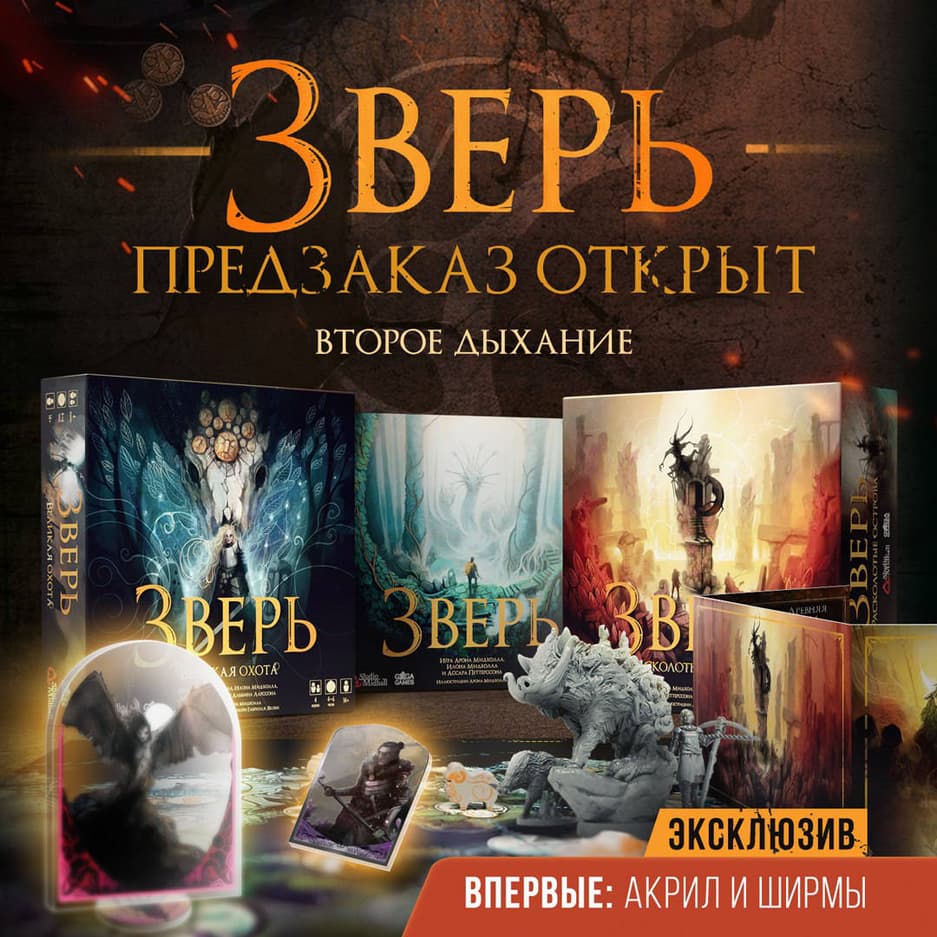 У русскоязычных игроков появился шанс приобрести эксклюзивные акриловые фигурки и ширмы для настольной игры «Зверь», которые ранее были доступны только спонсорам на краудфандинговой платформе Gamefound. Также вновь можно предзаказать дополнения «Расколотые Острова» и «Великая Охота».