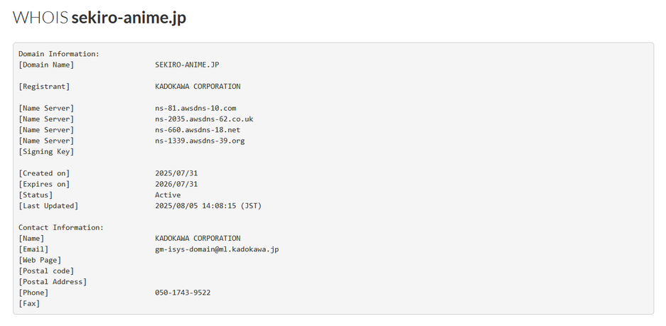 Внимательный фанат обнаружил в сети домен sekiro-anime.jp, предположительно связанный с аниме-адаптацией Sekiro: Shadows Die Twice. Домен был зарегистрирован компанией Kadokawa — материнской структурой FromSoftware и одним из крупнейших медиахолдингов Японии.