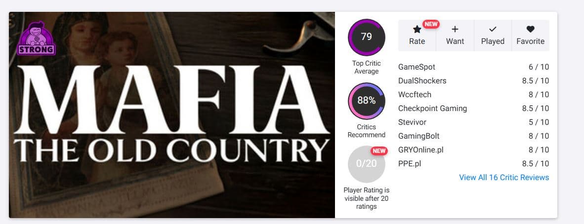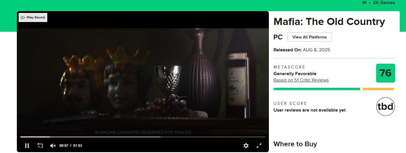 2K Games сняла эмбарго на публикацию обзоров на Mafia: The Old Country. Критики хвалят визуальную составляющую актерскую игру и сюжет, но при этом отмечают, что сценаристам хорошо бы было добавить побольше неожиданных поворотов.