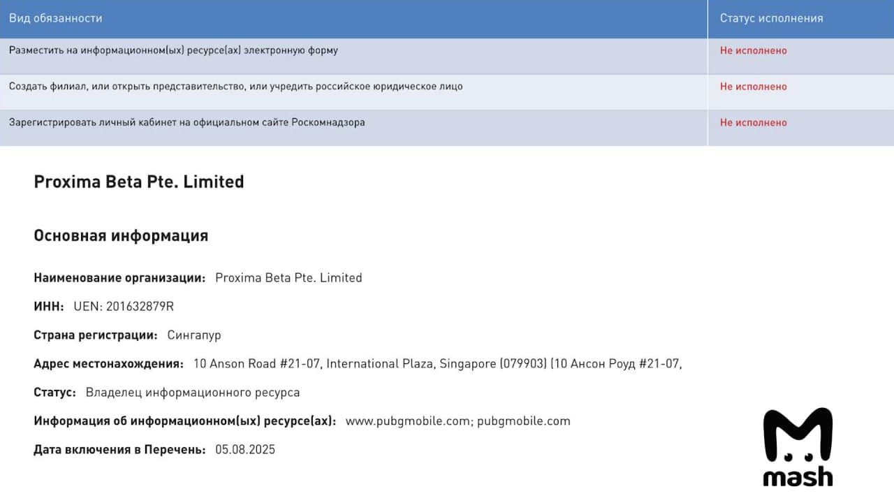 Компания Proxima Beta, выступающая издателем PUBG Mobile, оказалась в центре внимания российских регуляторов. По информации Mash, Роскомнадзор потребовал от компании открыть официальное представительство в России, зарегистрироваться в реестре организаторов распространения информации (ОРИ) и предоставить сведения о себе на сайте ведомства.