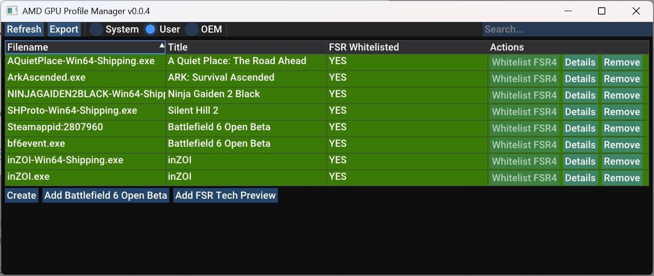 Новая утилита GPU Profile Manager, опубликованная на GitHub пользователем Mixaill, даёт доступ к внутренним базам данных драйвера AMD Adrenalin и позволяет изменять игровые профили. Среди доступных параметров — настройки, связанные с FSR, что и делает возможной активацию FSR 4 в обход официального списка совместимых игр.
