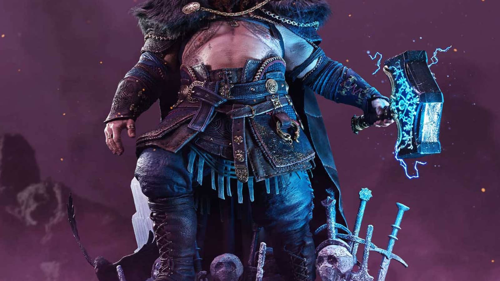 Каждая деталь, будь то мощное тело с грубой текстурой кожи, кожаные доспехи с традиционными узорами или потрёпанные металлические элементы, говорит о долгом и утомительном пути. Даже Мьёльнир, символ его гнева, сочетает брутальный силуэт с тончайшей проработкой.