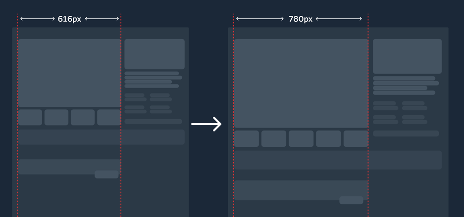 Ширина основной колонки теперь составляет 780 пикселей — ранее было 616 px: