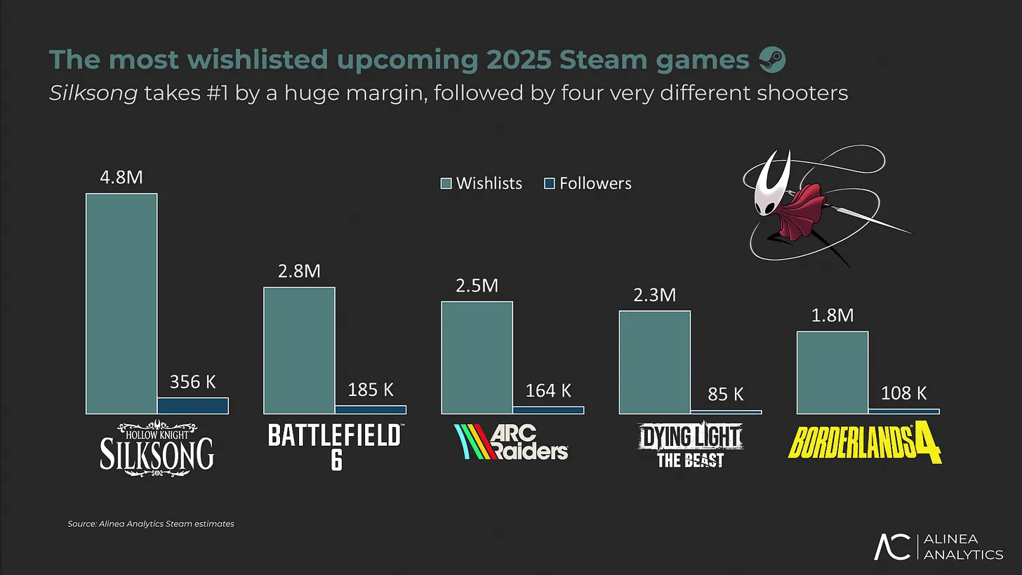Топ-5 самых желанных не выпущенных новинок 2025 года по числу вишлистов в Steam выглядит так (Alinea Analytics):