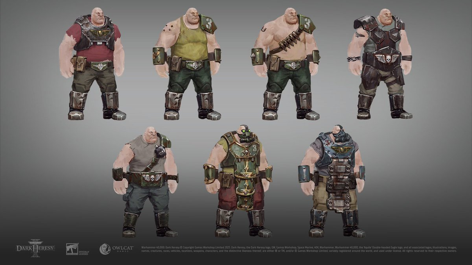 «В Warhammer 40,000: Dark Heresy вы столкнетесь со многими новыми созданиями, включая Огринов. На этом концепт-арте представлены вариации одежды и брони этих гигантов. Они — незаменимое орудие войны для Империума, которого страшатся многие».