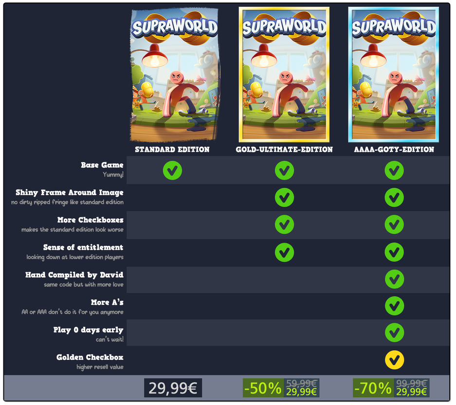 Для Supraworld представили сразу несколько «изданий» — Standard Edition, Gold-Ultimate-Edition и AAAA-GOTY-Edition. Каждое, с учётом шуточной скидки, стоит одинаково.