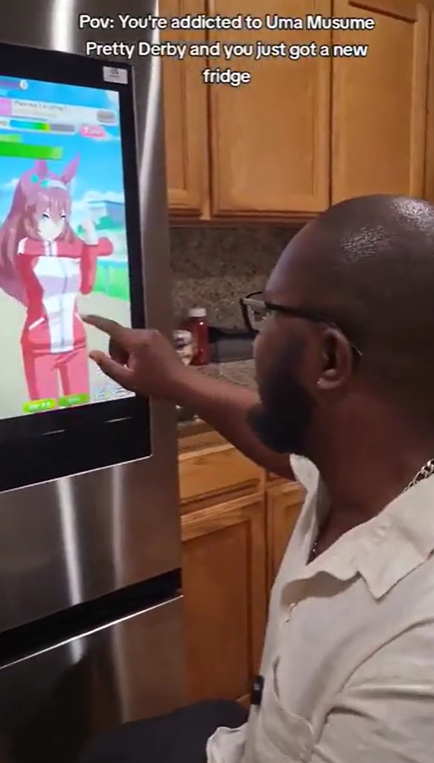 Недавно в сообществе Umamusume завирусилась запись игрока, который тренирует девочек-пони на нестандартном «игровом» устройстве: он воспользовался крупным экраном на холодильнике, чтобы поиграть в Umamusume Pretty Derby.
