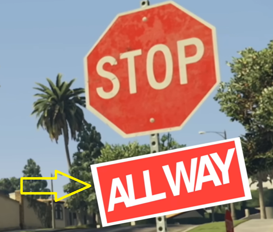 Например, знак «Стоп»: согласно правилам, «на перекрёстках, где все подходы контролируются знаком "стоп"» под знаками ними должна быть дополнительная табличка, однако в GTA 5 она отсутствует. Таким образом они не соответствуют техническому стандарту.