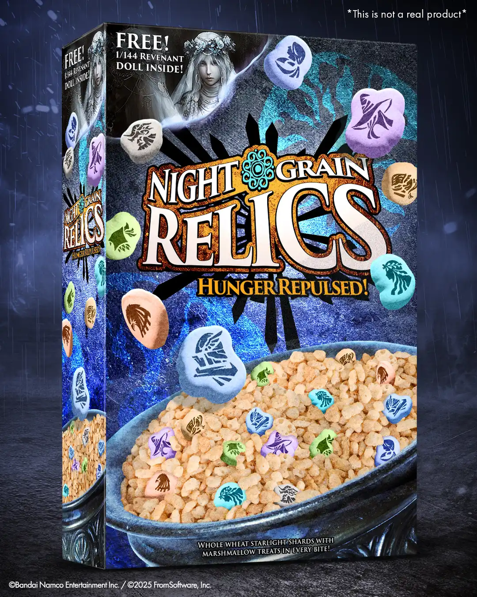 Это сухой завтрак «Night Grain Relics» в стиле игры FromSoftware: «цельнозерновые осколки звёзд с маршмеллоу».