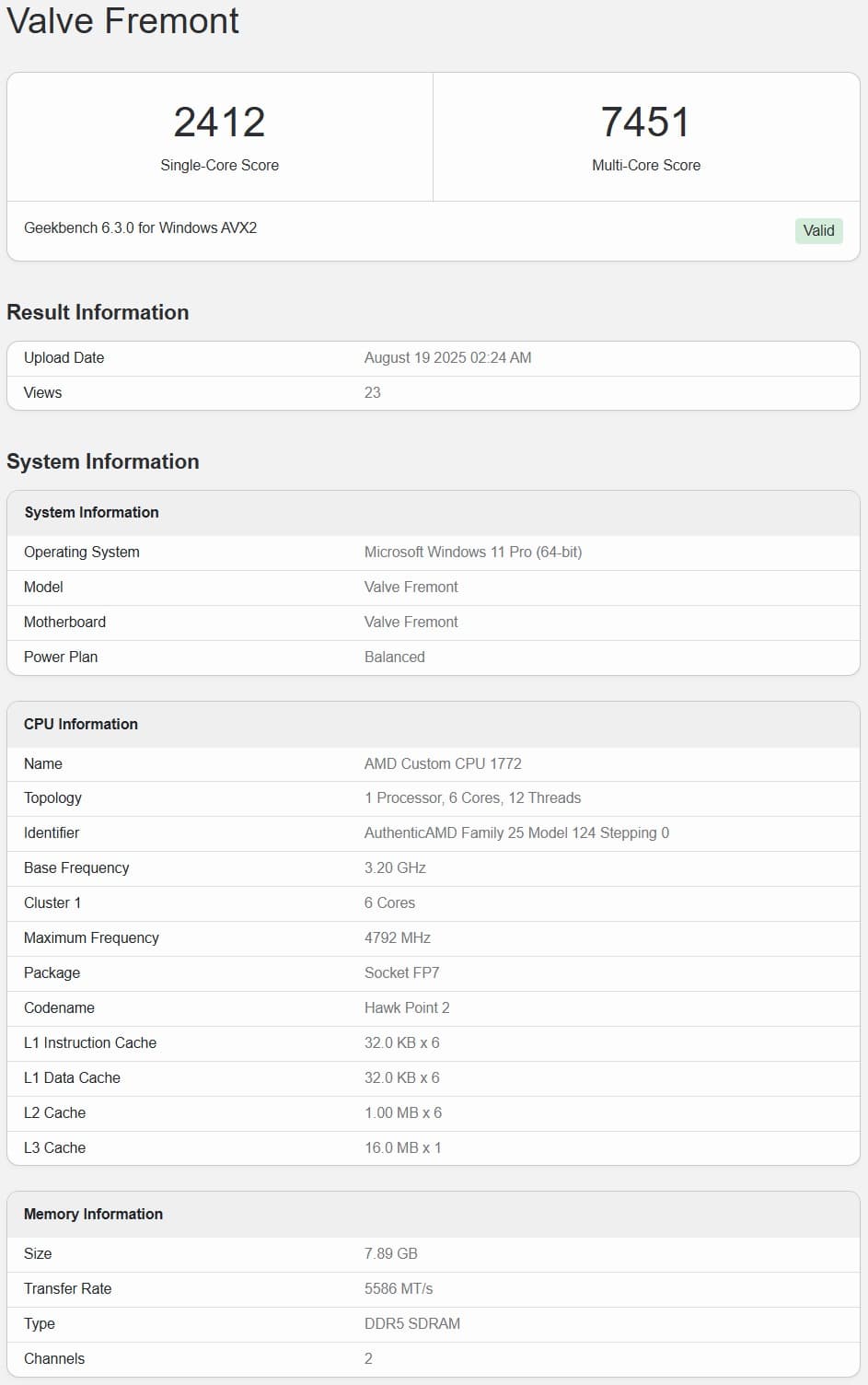 Geekbench фиксирует 2412 баллов в однопоточном тесте и 7451 в многопоточном, причём при запуске на Windows 11. Это серьёзное превосходство над текущими моделями Valve.