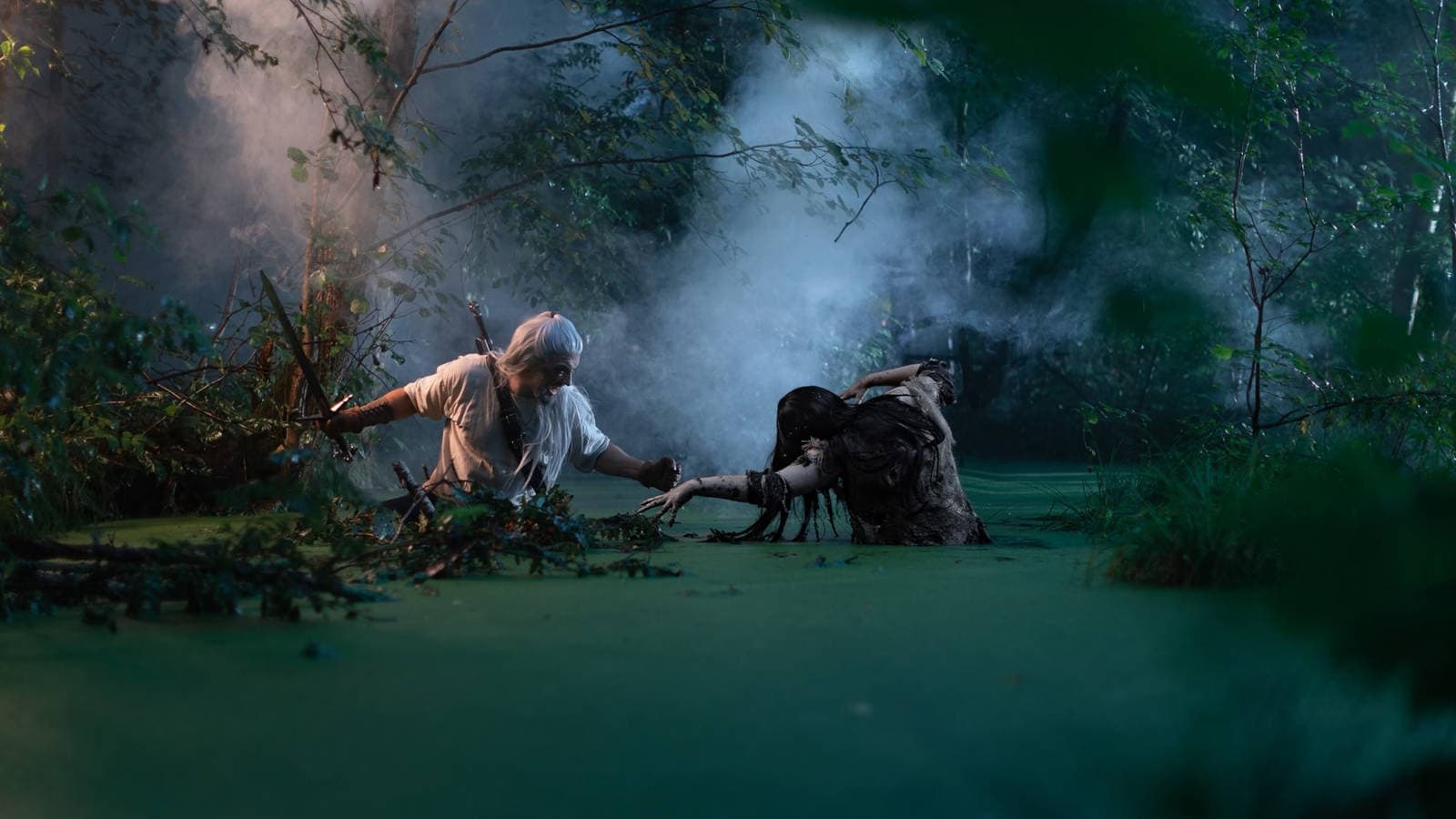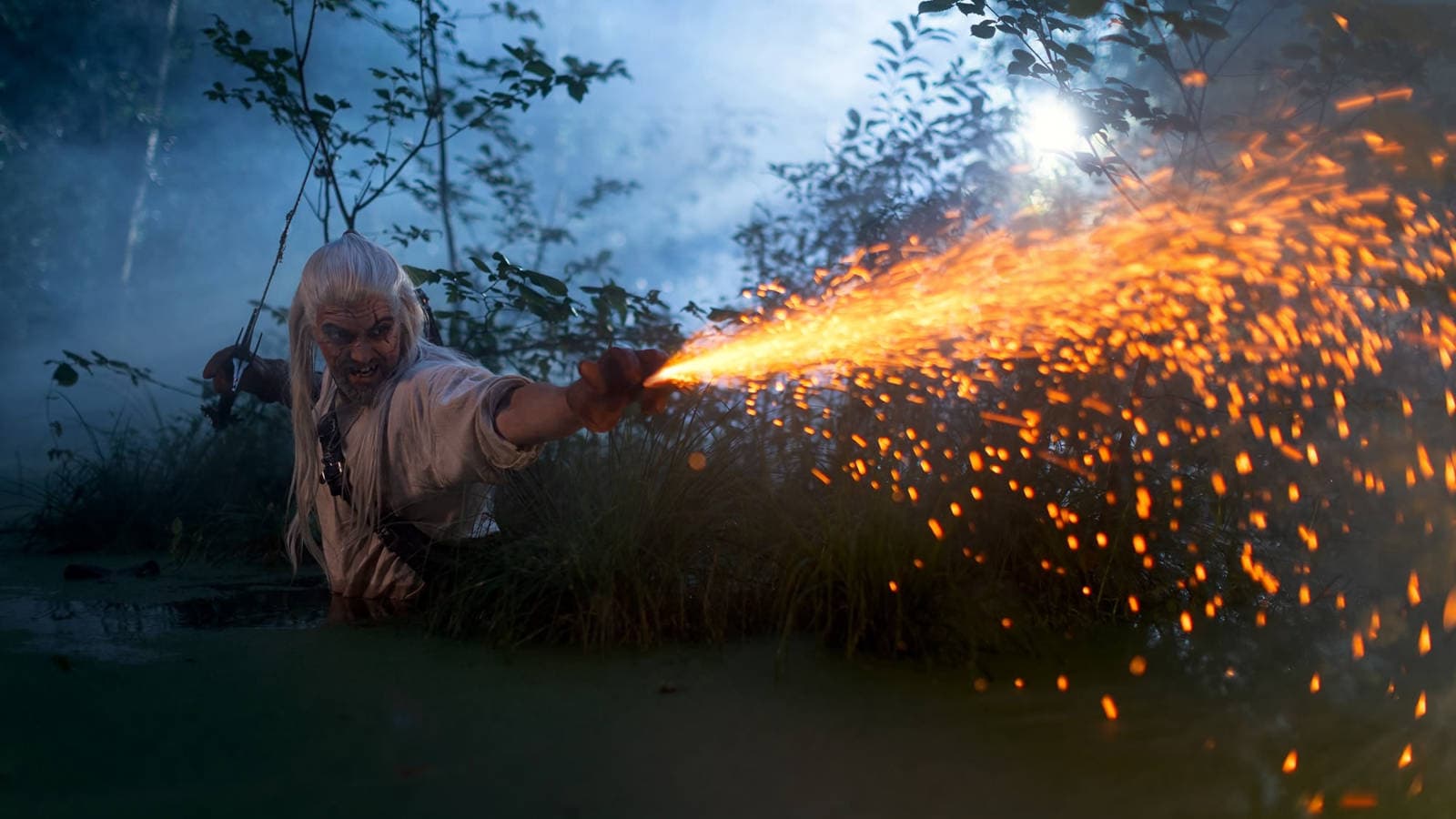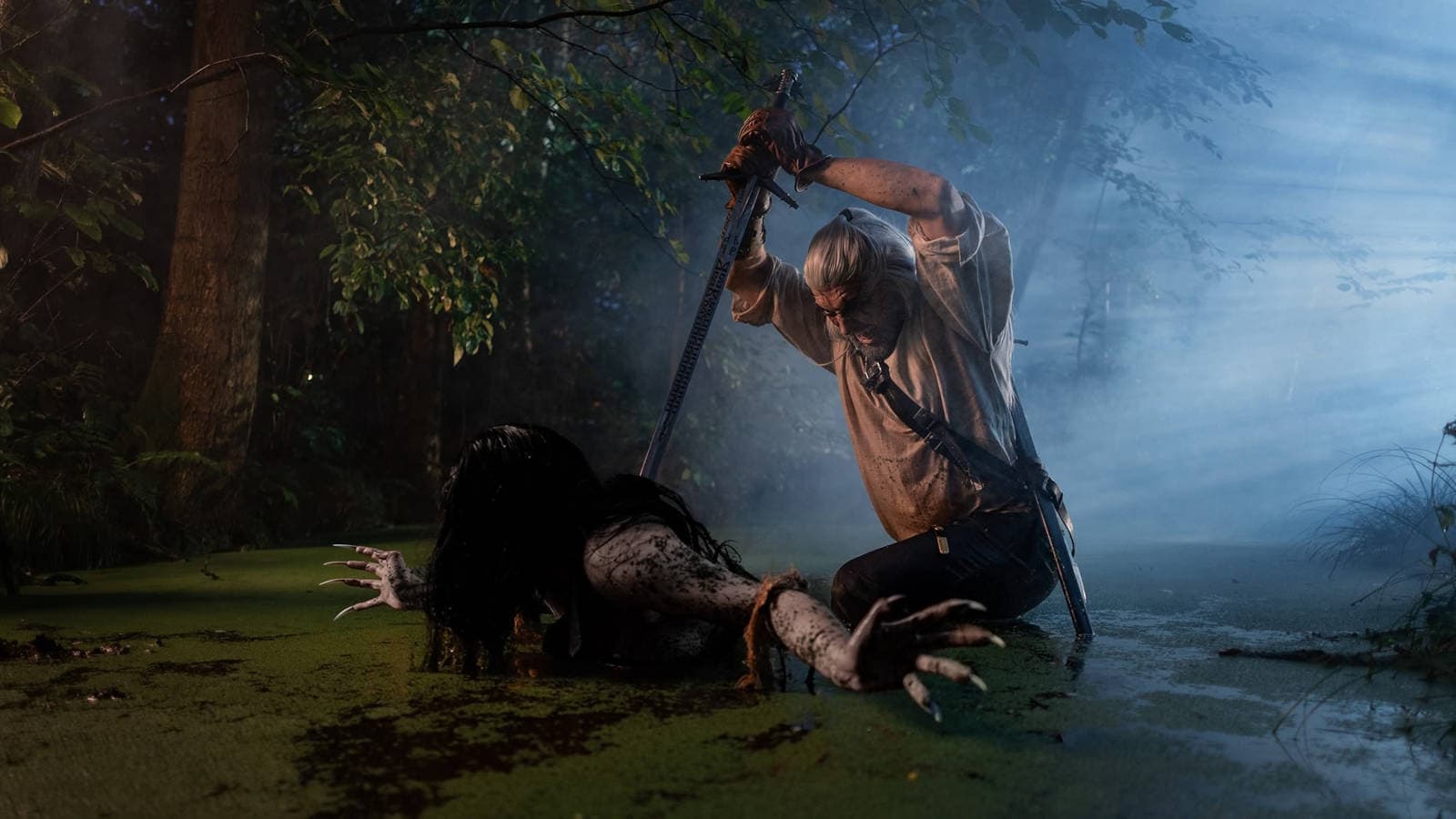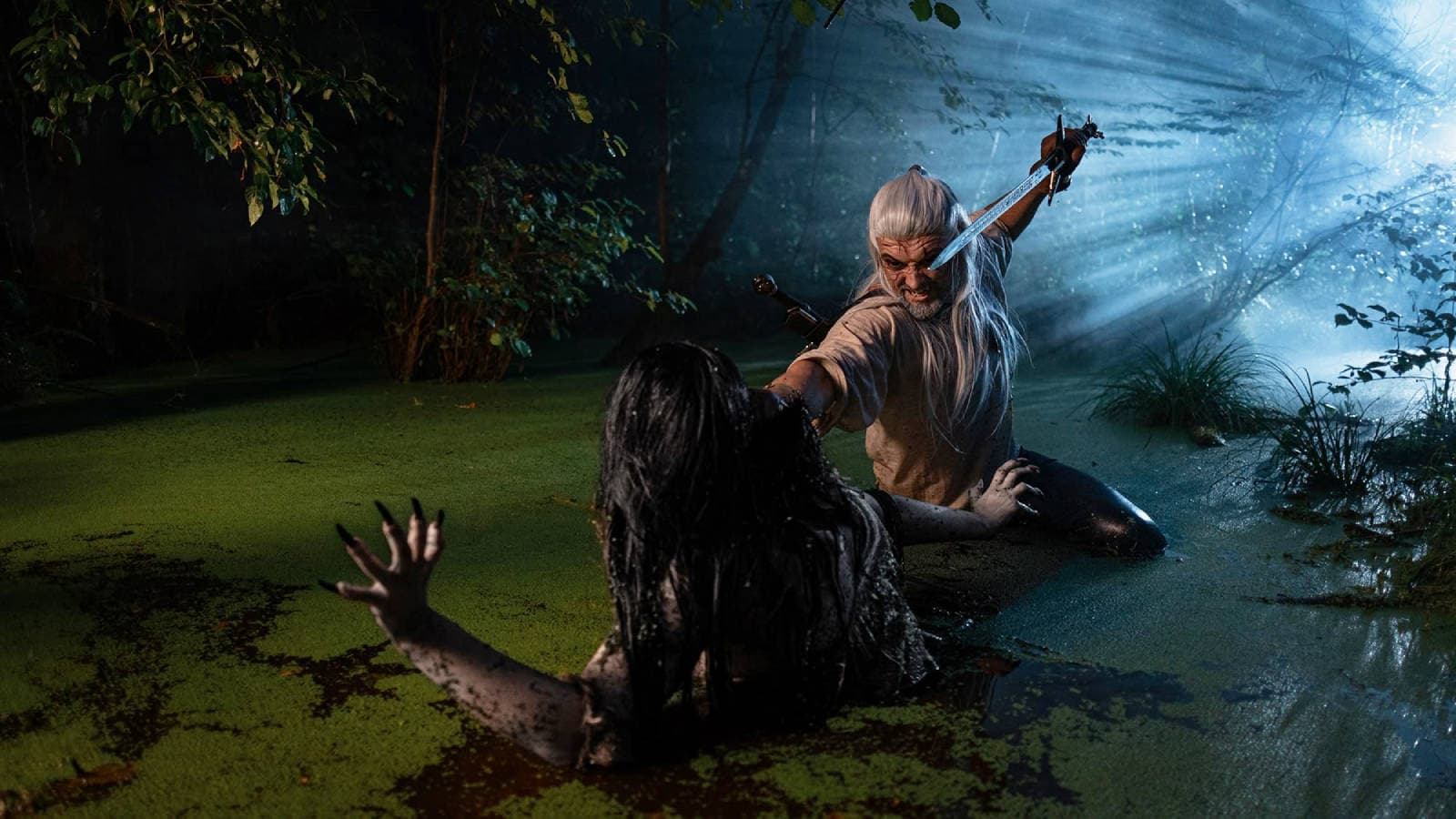 Косплеер Иван Кондрашин превратился в Геральта из игры «Ведьмак 3: Дикая Охота», чтобы на одном из болот Велена сразиться с Водной бабой, роль которой исполнила модель Дарья Шерман.