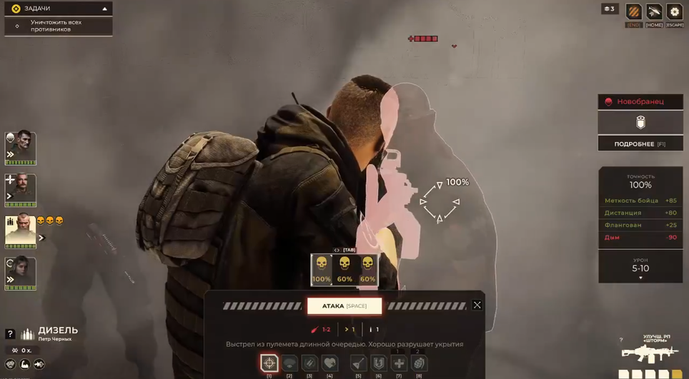 «Если противник находится в дыму на расстоянии до 2 клеток, его можно увидеть и атаковать…. Используйте дым не только для защиты, но и для неожиданных атак».
