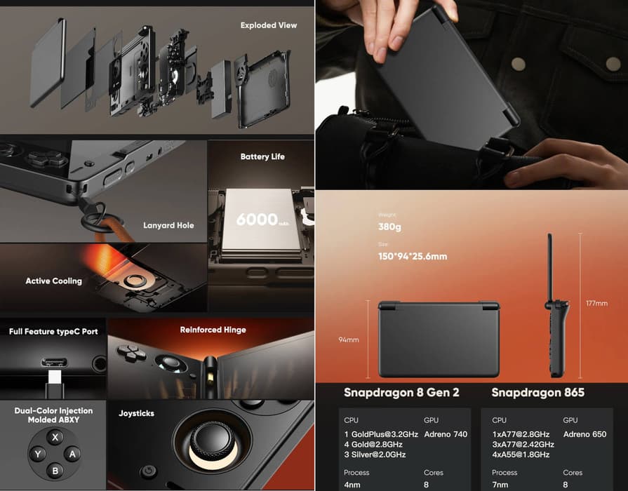 Base, Pro и Max версии устройства получили чип Snapdragon 8 Gen 2, графический процессор Adreno 740@680МГц, активное охлаждение, оперативную память LPDDR5x@4200МГц (8ГБ | 12ГБ | 16ГБ), встроенную память UFS4.0 (128ГБ | 256ГБ | 1ТБ), аккумулятор на 6000 мАч (скорость зарядки – 27 Ватт), Wi-Fi 7 и BT5.3, USB 3.1 Type C, 3,5-мм аудиоразъём, слот для TF-карты, видеовыход DisplayPort 4Kp60 Alt Mode и ОС Android 13.