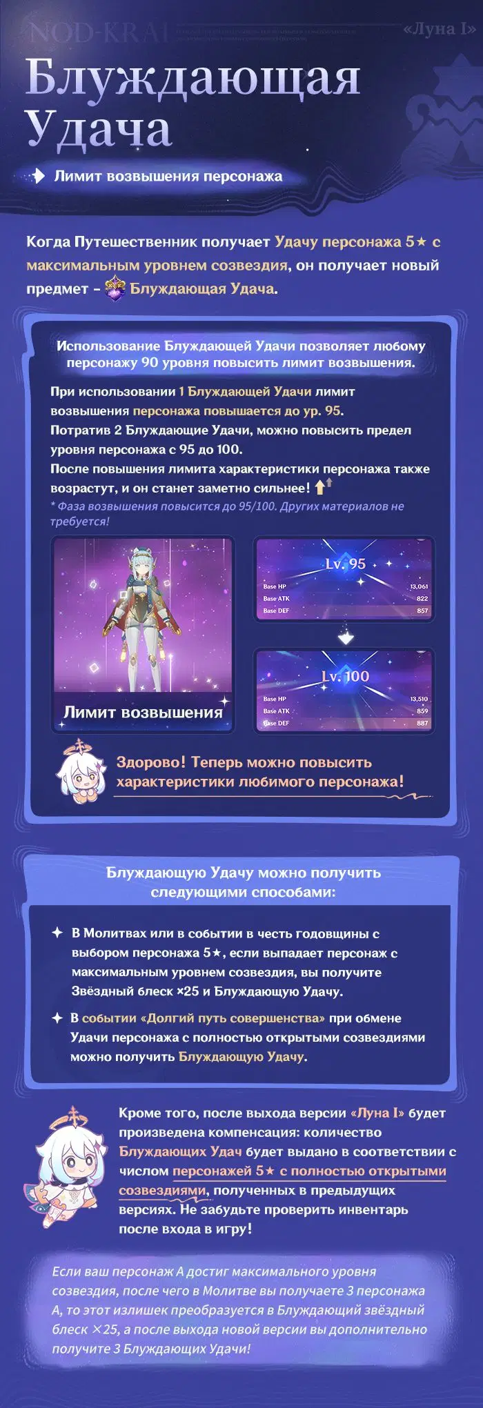 Также стали известны нюансы поднятия уровня выше 90-го — необходимо использовать новый предмет «Блуждающая удача». Его выдают, когда игрок получает «Удачу персонажа с 5 звездами редкости с максимальным уровнем созвездия». Для прокачки с 90 до 100 нужно две Блуждающих удачи.