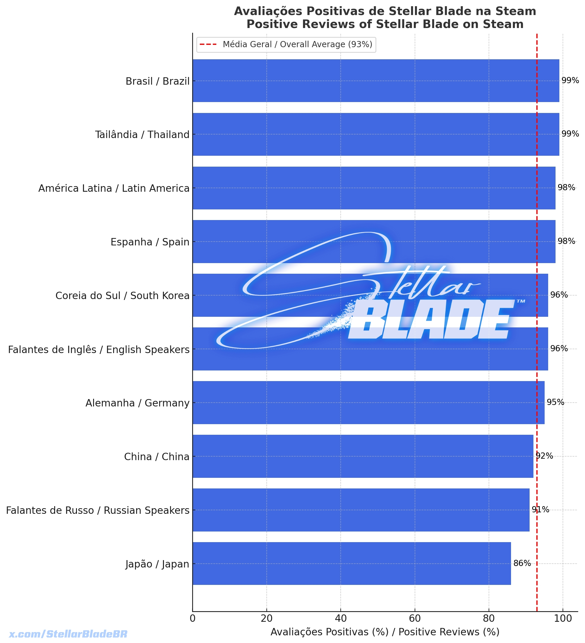 Согласно их анализу, в Бразилии рейтинг Stellar Blade 99% — первое место.