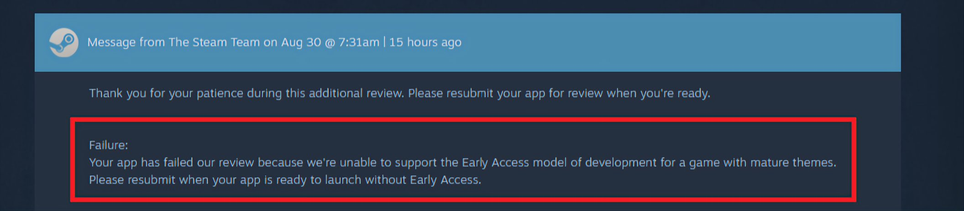 «Отказ: ваше приложение не прошло проверку, поскольку мы не можем поддерживать модель раннего доступа для разработки игр со "зрелыми [взрослыми] темами". Пожалуйста, отправьте заявку повторно, когда ваше приложение будет готово к релизу без раннего доступа».