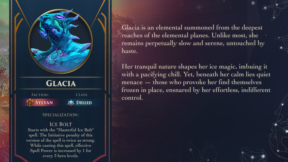 Глация — это элементаль, призванный из глубин. В отличие от большинства, она всегда медлительна и безмятежна, не подвержена спешке.