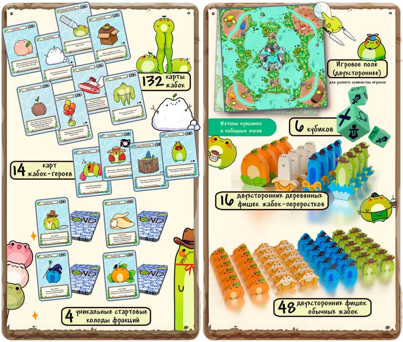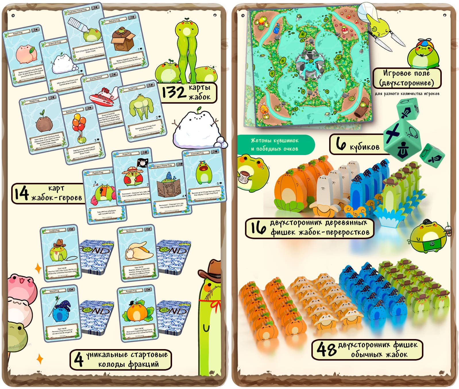 Состав игры выглядит следующим образом: 132 карты жабок, 14 карт жабок-героев, четыре уникальные стартовые колоды фракций, двустороннее игровое поле, шесть кубиков, 16 двусторонних деревянных фишек, 48 двусторонних фишек.