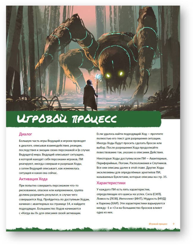 Некоторые люди называют эту настолку «DW минус D&D» или «Dungeon World без лишних атрибутов D&D». Из игры убраны многие условности классических НРИ: никаких устаревших характеристик вроде «Телосложения» или подсчета Пунктов Здоровья, нет перегрузки инвентаря золотом, списков снаряжения, расовых ограничений или морализаторского мировоззрения. Плюс присутствует соло-режим.