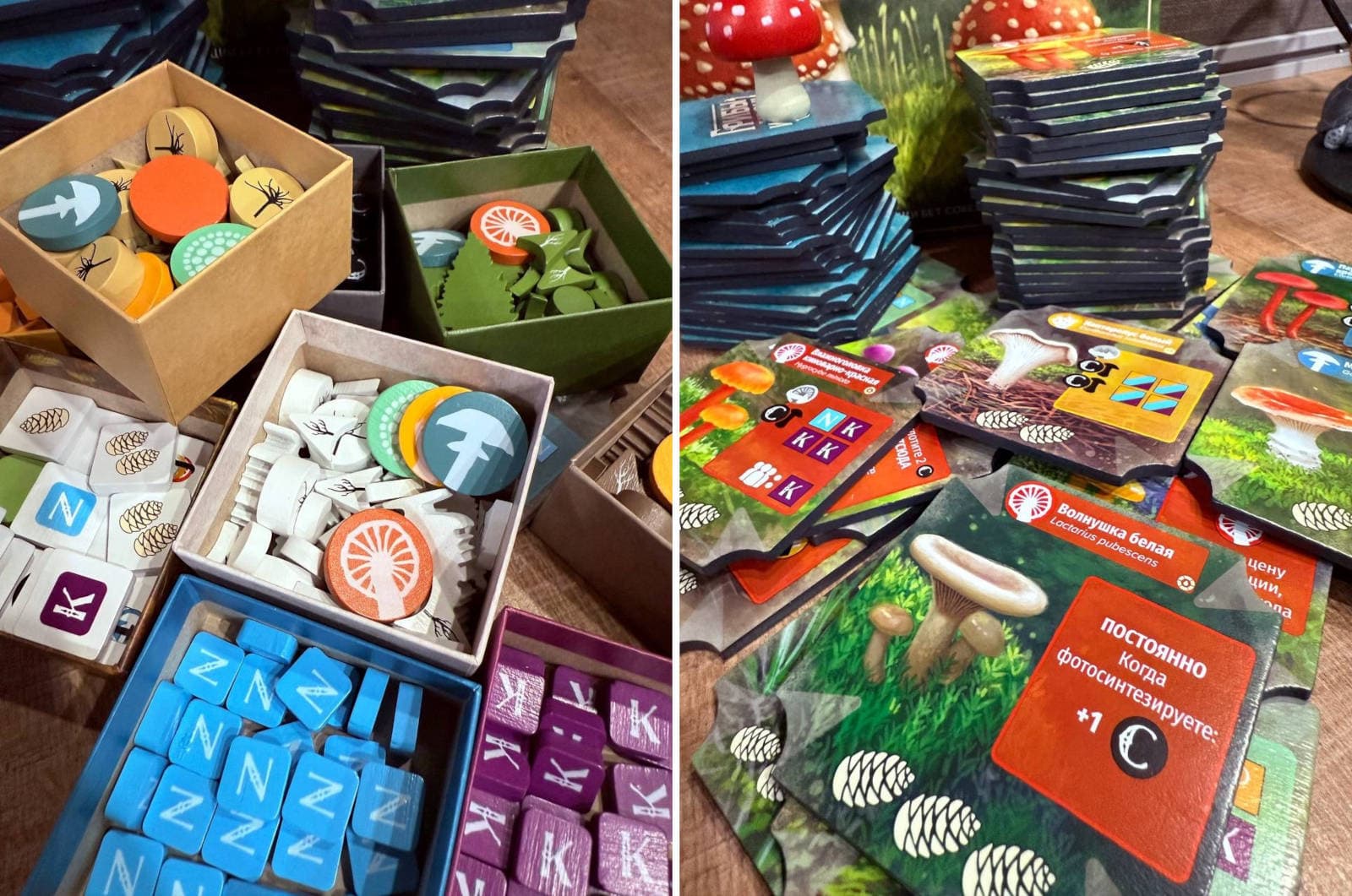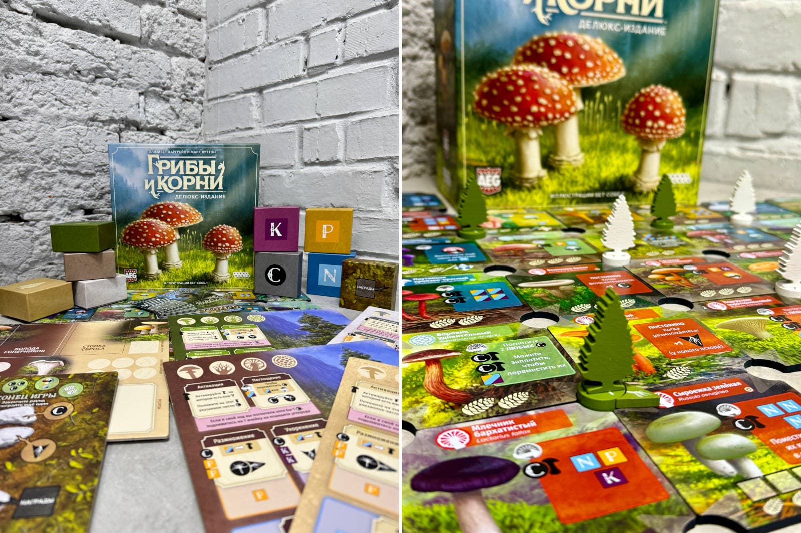 В «Делюкс-издание» настолки входят базовая версия «Грибов и корней», дополнение «Шёпот леса» и улучшенные комплектующие: деревянные фигурки, жетоны и планшеты вместо картонных, более наглядные фишки химических элементов, справочник по грибам и коробочки для удобного хранения компонентов.