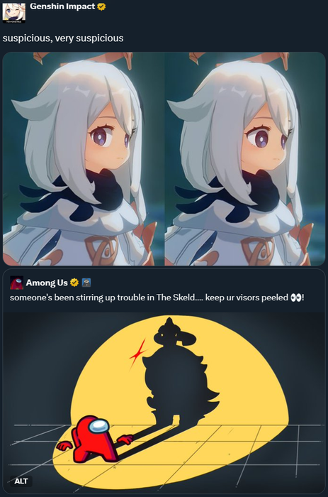 Фанаты Genshin уверены, что эта тень — Паймон. Разработчики Among Us добавили подпись к изображению: «кто-то устраивает беспорядки в Скелде... держите визоры открытыми!».