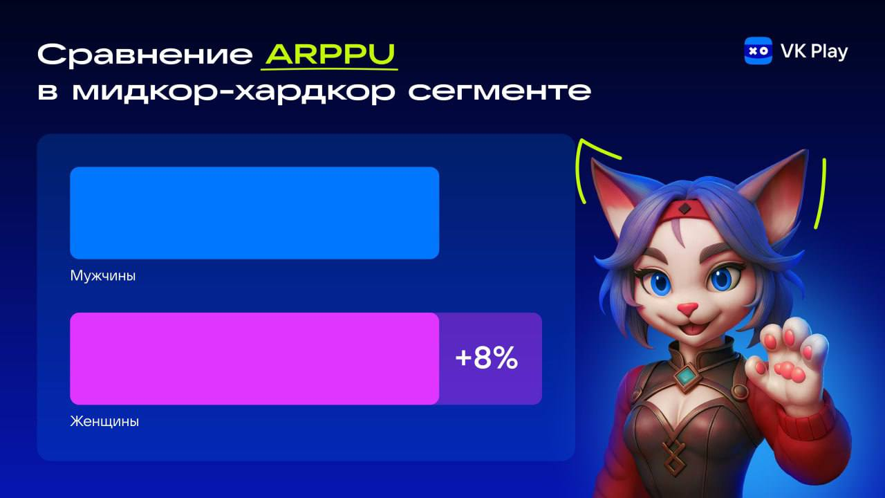 Оказалось, что игроки-женщины в мидкор-хардкор сегменте приносят на 8% больше выручки, чем мужчины.