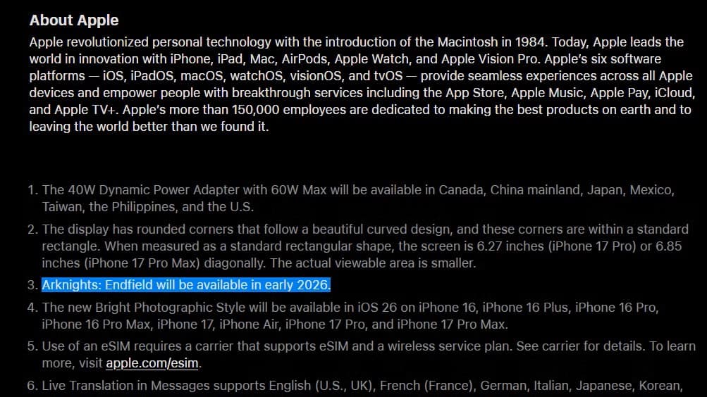 Ролевая игра в аниме-стилистике Arknights: Endfield, похоже, выйдет позже, чем надеялись некоторые фанаты. На официальной странице iPhone Air временно появилось упоминание, что игра выйдет «в начале 2026 года». Позже эту формулировку убрали, заменив её стандартной с оговоркой о возможных изменениях сроков релиза.