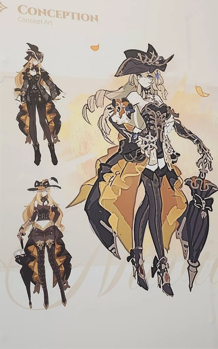 Например, можно увидеть несколько вариантов дизайна Архонта Пиро: на определённом этапе предполагалось, что у Мавуики будет глубокое декольте, также рассматривался образ с вырезом на животе и боках. Помимо этого, был вариант с облегающим костюмом, закрывавшим всё тело.