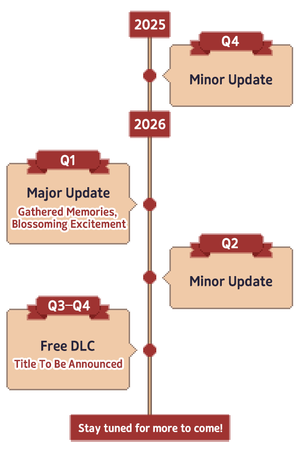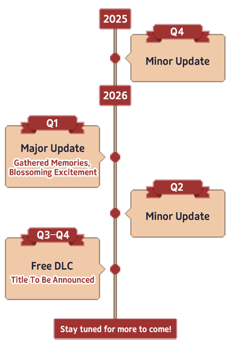 Разработчики подтвердили поддержку сохранений из раннего доступа и опубликовали дорожную карту. До конца 2025 года планируется ещё одно обновление, а в первом квартале 2026-го выйдет крупный апдейт со сбором воспоминаний и событием «восторг цветения». В дальнейшем ожидается бесплатное сюжетное дополнение, запланированное к релизу в 3-4 квартале 2026 года.