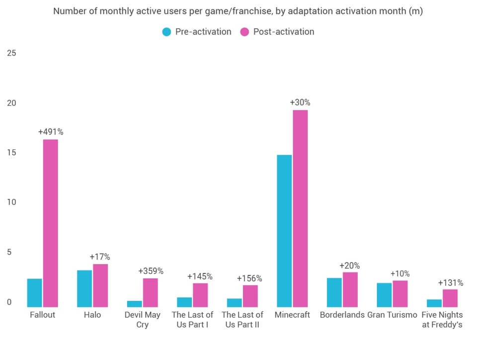 По данным исследования, телевизионные адаптации в среднем увеличивают число активных игроков на 203% после выхода сериала. Фильмы дают меньший эффект, но всё же заметный — плюс 48%.