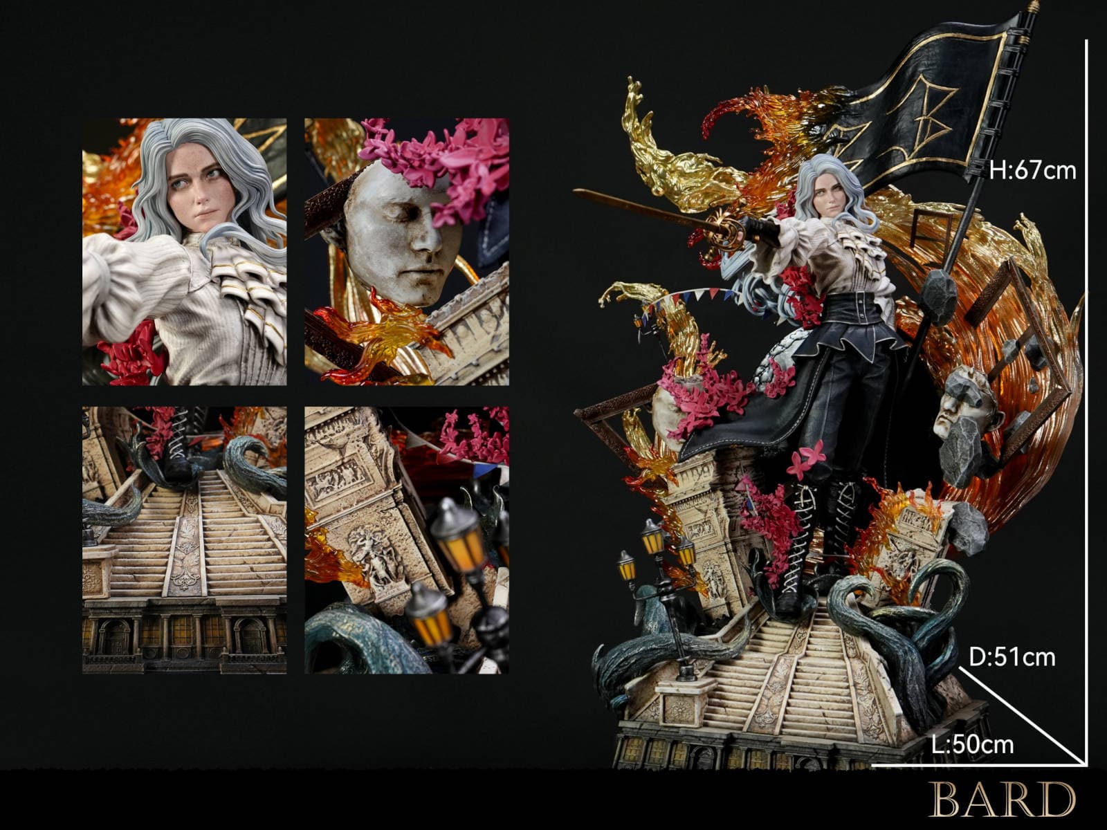 Высота коллекционного предмета равна 67 см, длина – 50 см, глубина – 51 см. В комплекте получится обнаружить две сменные головы, две сменные руки, тело и подставку со светодиодной подсветкой.
