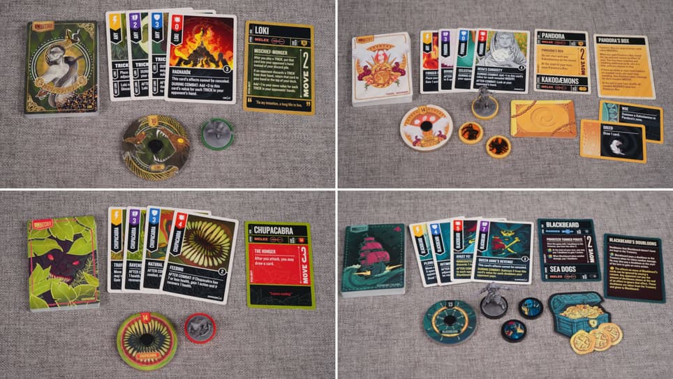 Колоды в данной настолке не просто уникальны – в них появились новые механики, характерные для персонажей. Локи способен манипулировать рукой противника, Чёрная Борода заставляет оппонента откупаться дублонами, Пандора проверяет игроков на жадность, а Чупакабра – на выносливость.