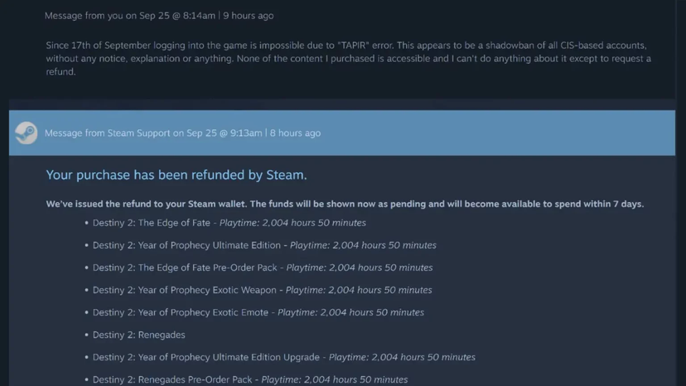 В сообщества стали появляться отзывы от игроков, которые смогли добиться возврата денег за Destiny 2: Edge of Fate и Year of Prophecy Ultimate Edition.