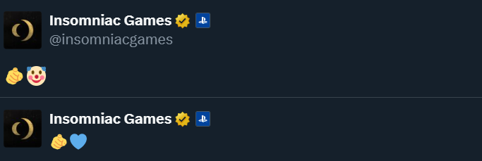 Вскоре в социальной сети появился «ответ» от Insomniac Games: разработчики опубликовали смайлик «клоун» и палец, который указывает на того, кто перед монитором; а следующий их пост содержал сердечко характерного цвета, отсылающего к Мистик.