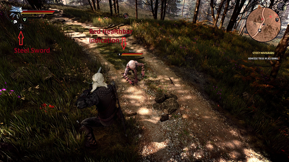 Масла можно наносить на любой меч и теперь если включено автоматическое убирание меча в ножны, то Геральт автоматически выхватывает нужный меч. Полоски здоровья были скорректированы для каждой категории монстров, чтобы отражать меч, который нужно против них использовать.