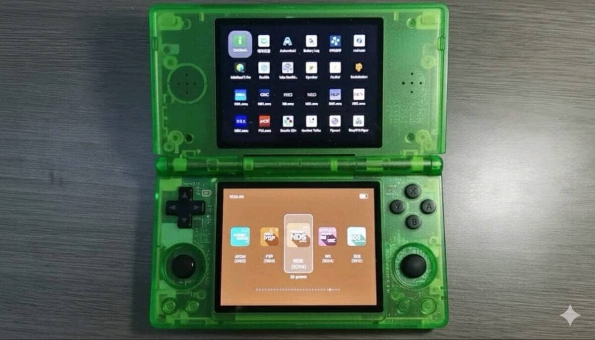 Новая консоль, получившая от портала Retro Handhelds название Anbernic RG DS, визуально похожа на Nintendo DS Lite/DSi. У неё есть два джойстика, расположенных под крестовиной и кнопками A/B/X/Y, дисплеи одинакового размера, два динамика, триггеры L1/L2/R1/R2 и разъём 3,5 мм для наушников.