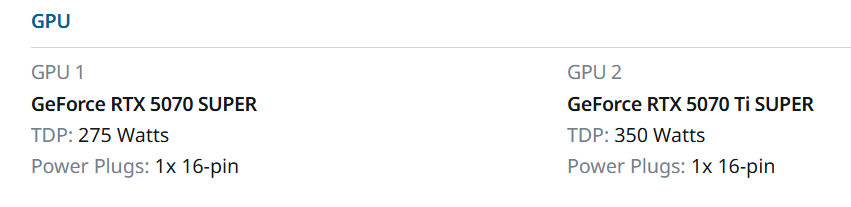 Появление этих карт может указывать на начало внутреннего тестирования или подготовку к релизу. По неофициальным данным, RTX 5070 Super получит 18 ГБ видеопамяти стандарта GDDR7, а RTX 5070 Ti Super — до 24 ГБ. Хотя эта информация не подтверждена, благодаря калькулятору Seasonic можно оценить ориентировочное значение теплопакета (TDP).