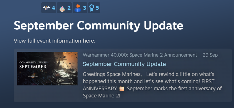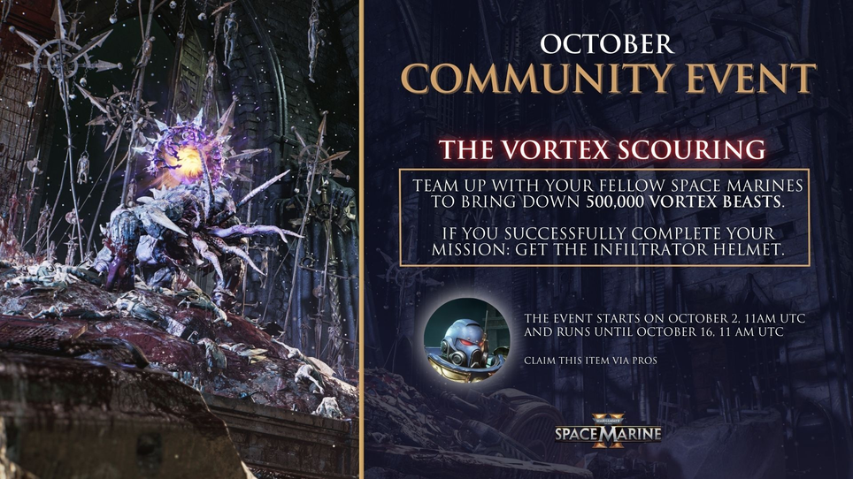 В октябре проведут Discord Quest: за 15 минут игры в демоверсию / полную версию Space Marine 2 разработчики предусмотрели награду; представили стильный образ для оружия. Помимо этого, в следующем месяце будет проводиться «событие сообщества» — нужно будет устранить 500 тысяч определённых врагов, чтобы заполучить в награду шлем.
