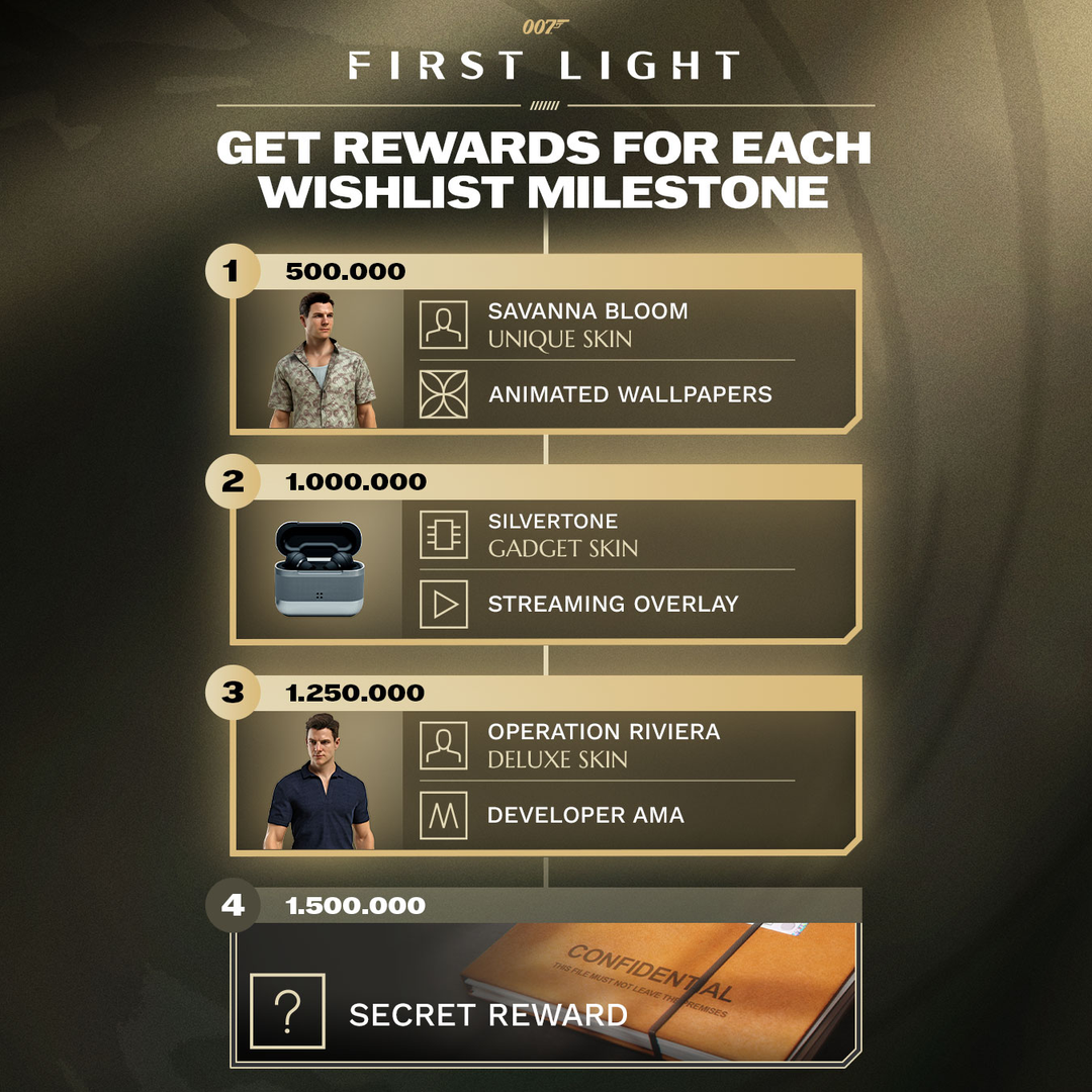 IO Interactive устроила промо-кампанию для 007 First Light. Игрокам предлагают добавить проект в список желаемого, а за достижение определённых вех вишлистов предусмотрены различные награды.