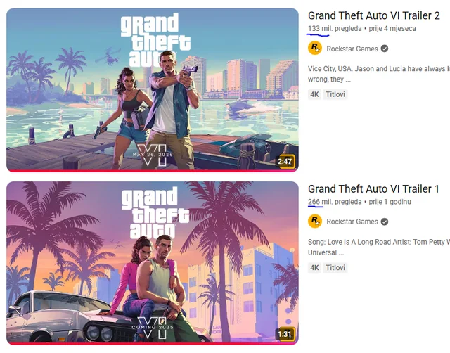 Rockstar Games не часто выпускает новые трейлеры Grand Theft Auto 6, поэтому увлечённые геймеры многократно пересматривают имеющиеся. Счётчики просмотров постепенно увеличиваются.