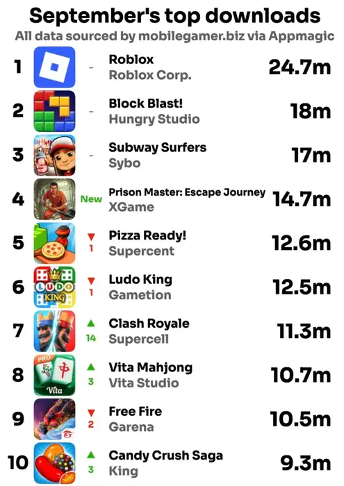 Roblox остаётся недосягаемой по числу установок, несмотря на заметное снижение — с рекордных для платформы 33 млн в августе до 25 млн в сентябре. Аналитики связывают спад с началом учебного года, когда у аудитории стало меньше времени на игры.