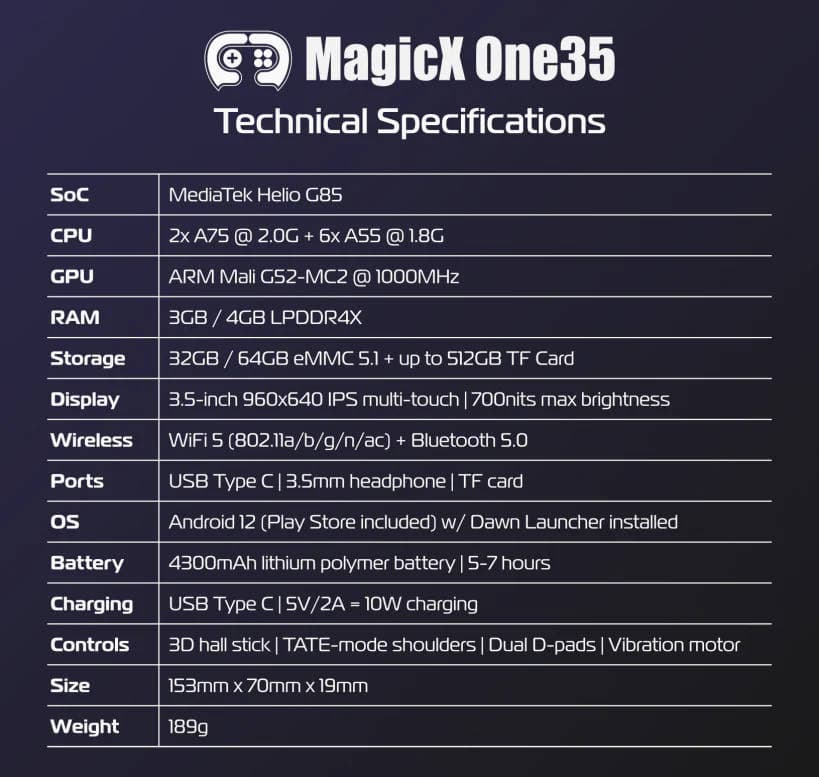 Также у консоли есть джойстики с 3D Hall-эффектом, плечевые кнопки, двойные крестовины, вибромотор, литий-полимерная батарея на 4300мАч (время работы: 5-7 часов). Размер и вес устройства: 153мм x 70мм x 19мм, 189 грамм. Рассылать MagicX One 35 начнут с 26 ноября.