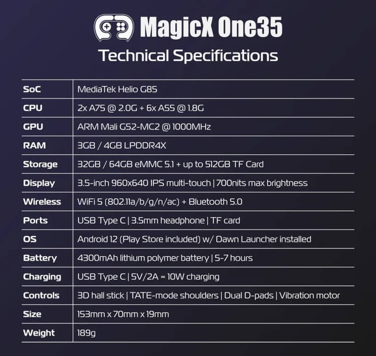 MagicX One 35 получила 3,5-дюймовый IPS-экран (разрешение – 960x640, мультисенсорный, 700 нит), чип MediaTek Helio G85 – 2x A75 @ 2.0ГГц + 6x A55 @ 1.8ГГц, графический процессор ARM Mali G52-MC2 @ 1000МГц, WiFi 5 (802.11a/b/g/n/ac), Bluetooth 5.0, USB Type C, 3,5-миллиметровый разъем для наушников.