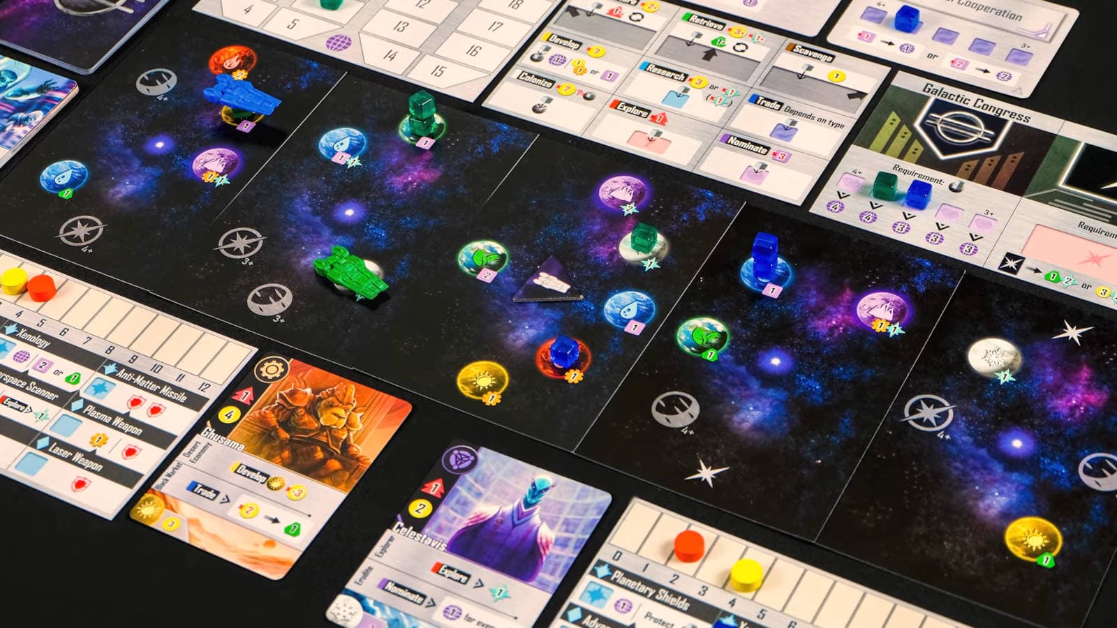 Состав коробки выглядит так: 58 карт, восемь планшетов, 36 фигурок крейсеров, восемь маркеров, 64 кубика действий, 28 жетонов артефактов и открытий, 15 жетонов влияния, девять жетонов исследования, пять жетонов планет, четыре жетона порядка хода, один жетон галактического флота и правила игры.