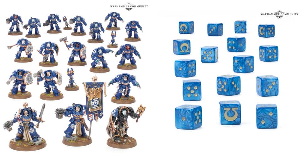 Удастся купить тематические кубики Ультрамаринов и их новый боевой патруль, содержащий старшего библиария Варрона Тигурия, пять Заступников, пять Налётчиков, трёх Агрессоров, трёх Ветеранов Клинковой гвардии, вышеуказанный набор улучшений и переводных декалей.